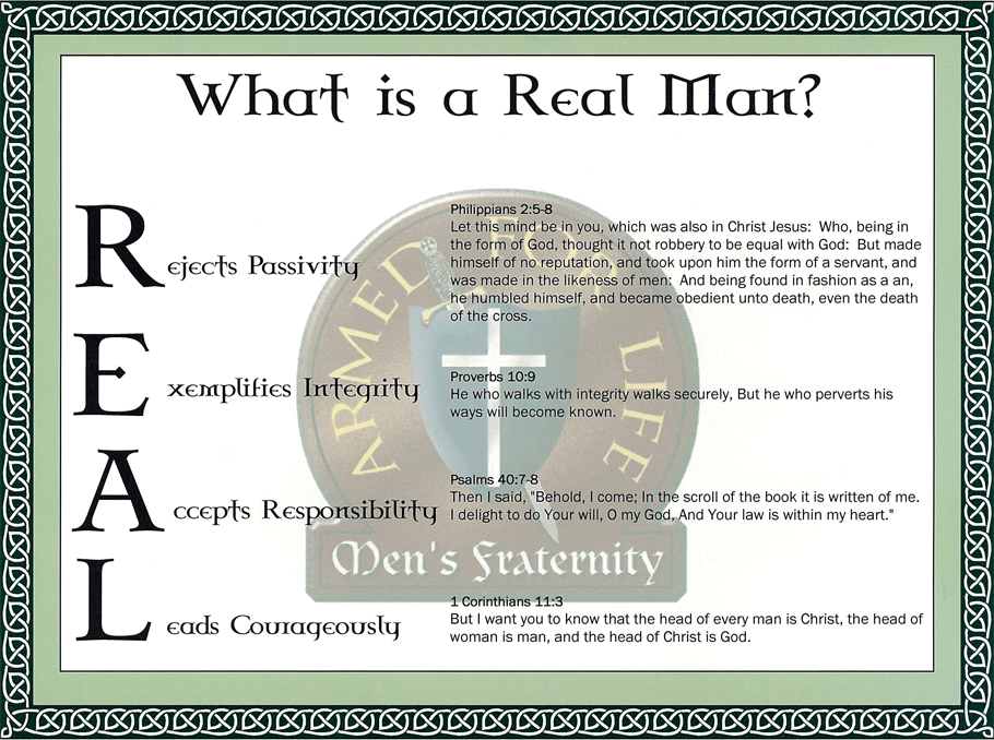 For years now I have contemplated the question, "What constitutes a man? A REAL man?" The answer is obviously beyond everything physical-that is the worldly standard. I have always resolved the response to this question to be "undecided" in my mind. If I had to give an answer I would have said something along the lines of "a Christ-like, mature man".